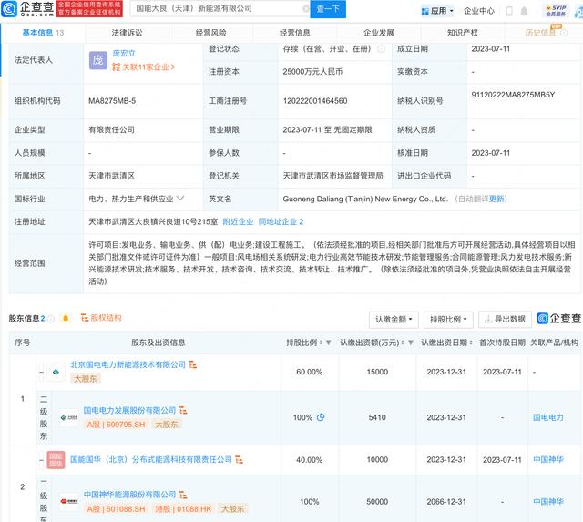 企查查APP顯示,近日,國能大良(天津)新能源有限公司成立,法定代表人為龐宏立,注冊資本2.5億元人民幣,經(jīng)營范圍包含:風(fēng)電場相關(guān)系統(tǒng)研發(fā);電力行業(yè)高效節(jié)能技術(shù)研發(fā);節(jié)能管理服務(wù);合同能源管理等。企查查股權(quán)穿透顯示,該公司由國電電力(600795)、中國神華(601088)間接共同持股。