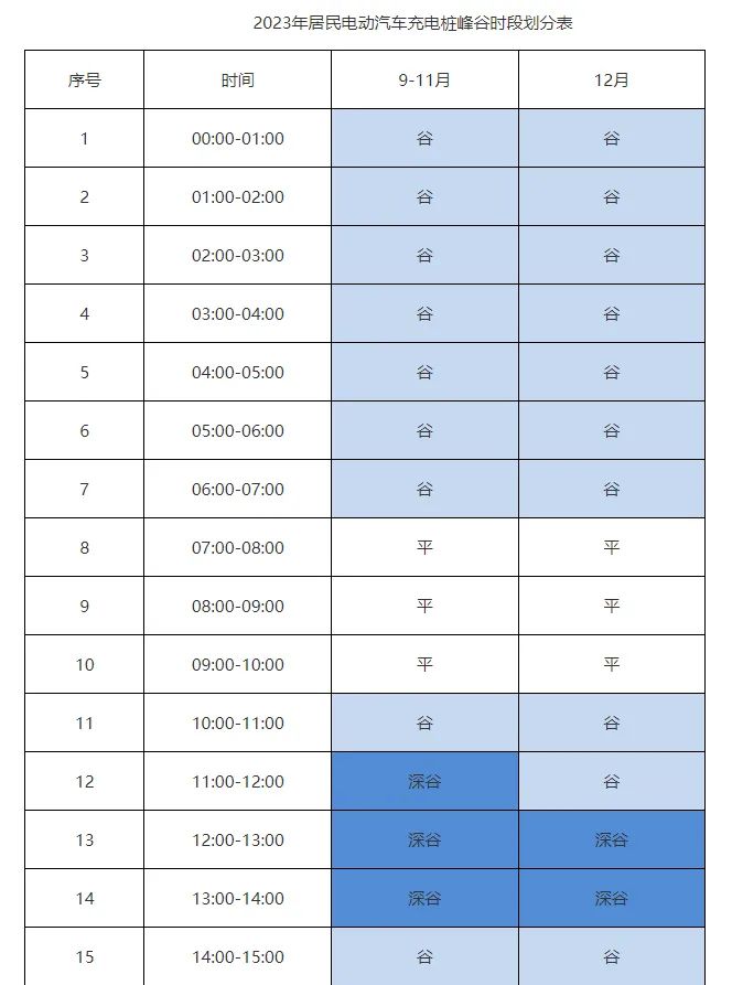 由此可見,如果車主選擇在深谷時(shí)段充電,將比之前的谷時(shí)段每度電節(jié)省0.163元。記者從時(shí)段劃分表可見,9月-11月的深谷時(shí)段為11點(diǎn)至14點(diǎn),12月的深谷時(shí)段為12點(diǎn)至14點(diǎn)。