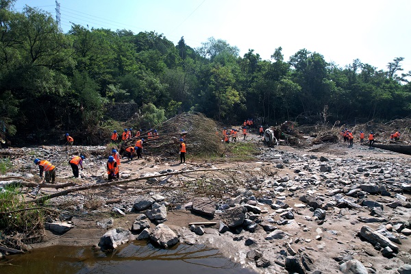 受臺風(fēng)“杜蘇芮”影響,門頭溝區(qū)遭遇極端降雨災(zāi)害,轄區(qū)河道水庫塘壩內(nèi)出現(xiàn)大量倒伏枯死林木、垃圾、建筑殘骸、車輛、淤泥,嚴(yán)重污染河湖環(huán)境,阻礙河道行洪。8月16日,中國能建葛洲壩集團(tuán)五家參建單位派出320余人,挖掘機(jī)32臺、鏟車12輛、油鋸120把、吊車5臺、運輸車25輛,擔(dān)負(fù)門頭溝12.9公里的河道清淤、樹木清理等任務(wù)。