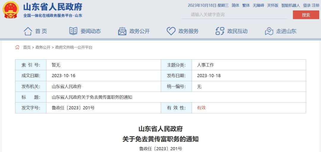 10月18日,山東省人民政府發(fā)布《關(guān)于免去黃傳富職務(wù)的通知》。