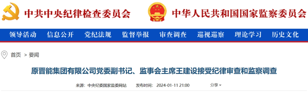 中央紀(jì)委國家監(jiān)委網(wǎng)站1月11日消息,據(jù)山西省紀(jì)委監(jiān)委消息:原晉能集團(tuán)有限公司黨委副書記、監(jiān)事會(huì)主席王建設(shè)涉嫌嚴(yán)重違紀(jì)違法,目前正接受山西省紀(jì)委監(jiān)委紀(jì)律審查和監(jiān)察調(diào)查。