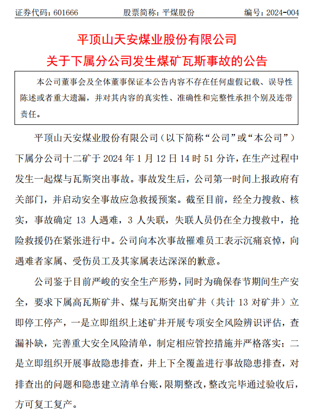 1月14日訊,平煤股份公告,下屬分公司十二礦于1月12日14時51分許,在生產(chǎn)過程中發(fā)生一起煤與瓦斯突出事故。截至目前,經(jīng)全力搜救、核實,事故確定13人遇難,3人失聯(lián),失聯(lián)人員仍在全力搜救中,搶險救援仍在緊張進行中。