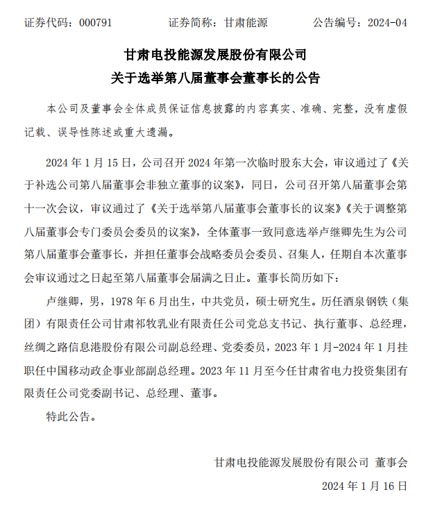 1月16日,甘肅能源發(fā)布公告,選舉盧繼卿先生為公司第八屆董事會董事長,并擔(dān)任董事會戰(zhàn)略委員會委員、召集人,任期自本次董事會審議通過之日起至第八屆董事會屆滿之日止。