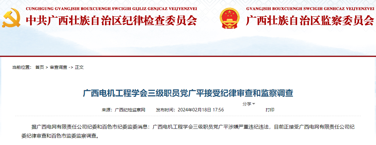 據(jù)廣西電網(wǎng)有限責(zé)任公司紀(jì)委和百色市紀(jì)委監(jiān)委消息:廣西電機(jī)工程學(xué)會(huì)三級(jí)職員黨廣平涉嫌嚴(yán)重違紀(jì)違法,目前正接受廣西電網(wǎng)有限責(zé)任公司紀(jì)委紀(jì)律審查和百色市監(jiān)委監(jiān)察調(diào)查。