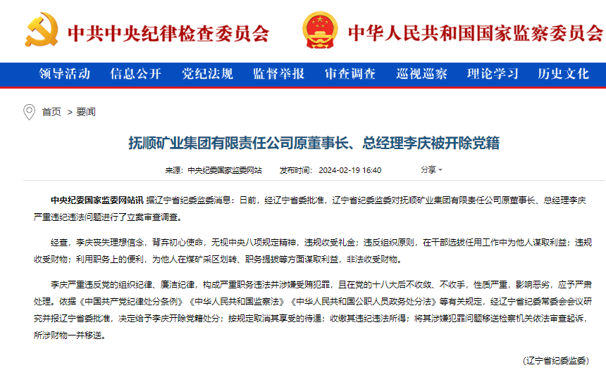 撫順礦業(yè)原董事長(zhǎng)李慶被開(kāi)除黨籍