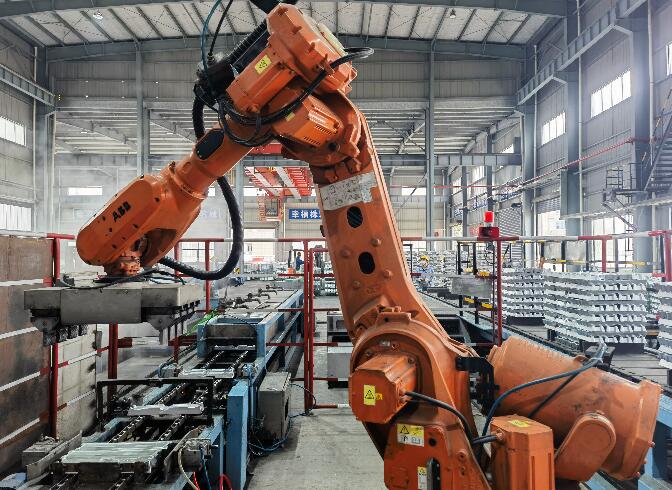 圖為中國五礦所屬株冶新材鑄造鋅合金自動(dòng)化生產(chǎn)線碼錠機(jī)器人