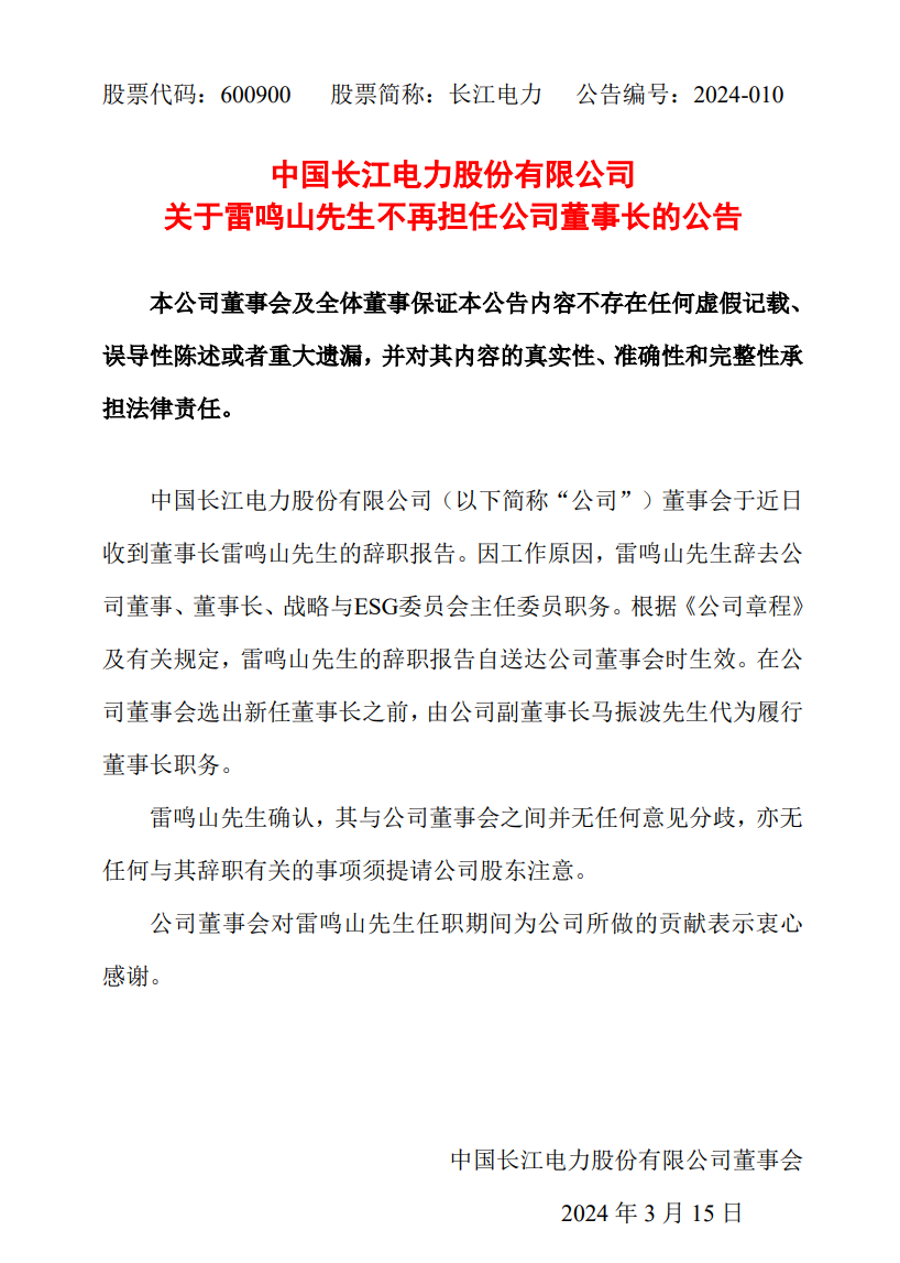 3月15日,長(zhǎng)江電力發(fā)布公告稱(chēng),公司董事會(huì)于近日收到董事長(zhǎng)雷鳴山先生的辭職報(bào)告。因工作原因,雷鳴山先生辭去公司董事、董事長(zhǎng)、戰(zhàn)略與ESG委員會(huì)主任委員職務(wù)。