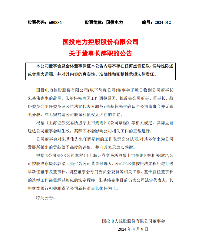 4月9日,國(guó)投電力發(fā)布公告稱,公司董事會(huì)于近日收到公司董事長(zhǎng)朱基偉先生的辭呈。朱基偉先生因工作調(diào)整原因,擬辭去公司董事、董事長(zhǎng)、戰(zhàn)略委員會(huì)主任委員及公司法定代表人職務(wù);朱基偉先生確認(rèn)與公司董事會(huì)并無(wú)意見(jiàn)分歧,亦無(wú)需提請(qǐng)公司股東和債權(quán)人關(guān)注的事宜。