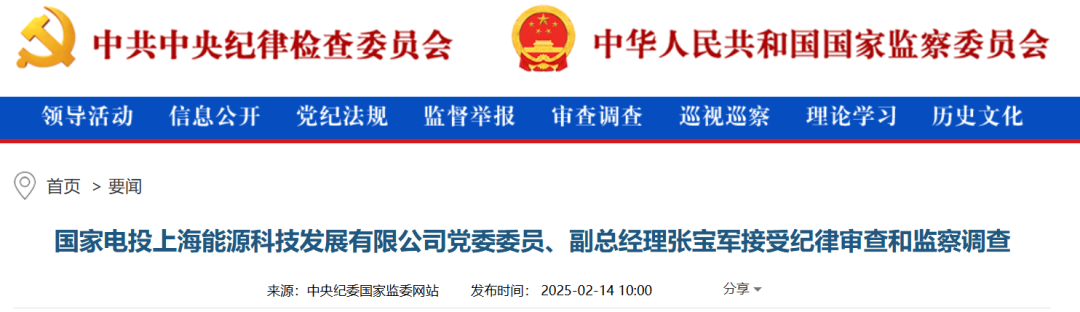 中央紀(jì)委國(guó)家監(jiān)委網(wǎng)站2月14日消息,據(jù)國(guó)家電投紀(jì)檢監(jiān)察組、山西省紀(jì)委監(jiān)委消息:國(guó)家電投上海能源科技發(fā)展有限公司黨委委員、副總經(jīng)理張寶軍涉嫌嚴(yán)重違紀(jì)違法,目前正接受國(guó)家電投紀(jì)檢監(jiān)察組和山西省長(zhǎng)治市監(jiān)委紀(jì)律審查和監(jiān)察調(diào)查。