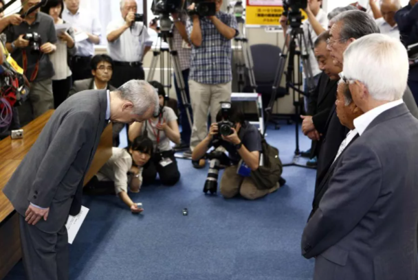 2013年8月29日,在日本東京,日本東京電力公司社長廣瀨直己(左)向全國漁業(yè)協(xié)會聯(lián)合會的代表鞠躬道歉。日本福島第一核電站先前曝出儲水罐放射性污水大量泄漏事件,引發(fā)日本漁業(yè)團(tuán)體擔(dān)憂和抗議。新華社/法新