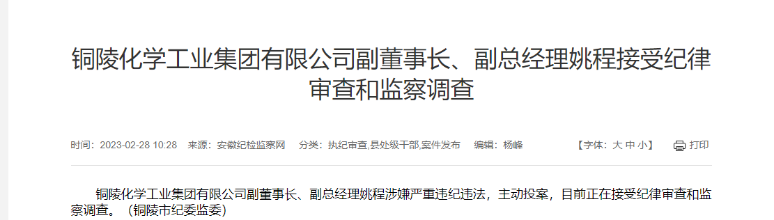 2月28日,安徽紀(jì)檢監(jiān)察網(wǎng)發(fā)布消息,銅陵化學(xué)工業(yè)集團(tuán)有限公司(簡(jiǎn)稱“銅化集團(tuán)”)副董事長(zhǎng)、副總經(jīng)理姚程涉嫌嚴(yán)重違紀(jì)違法,主動(dòng)投案,目前正在接受紀(jì)律審查和監(jiān)察調(diào)查。