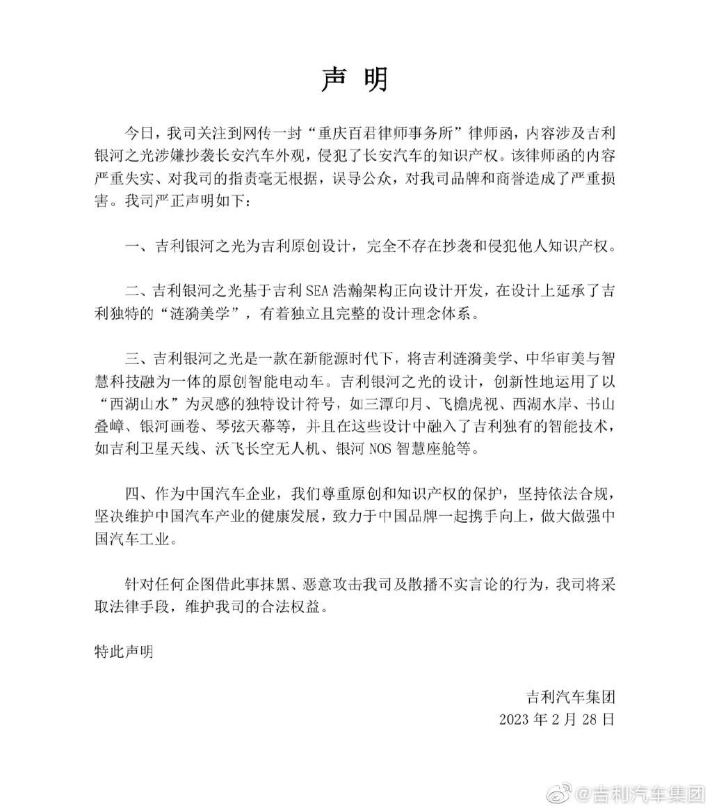 針對抄襲傳聞,吉利汽車直斥上述律師函“內(nèi)容嚴重失實、指責毫無根據(jù),誤導(dǎo)公眾,對我司品牌和商譽造成了嚴重損害。”根據(jù)吉利汽車2月28日發(fā)布的聲明,吉利銀河之光為吉利原創(chuàng)設(shè)計,完全不存在抄襲和侵犯他人知識產(chǎn)權(quán)。