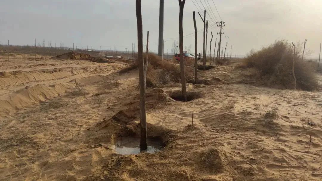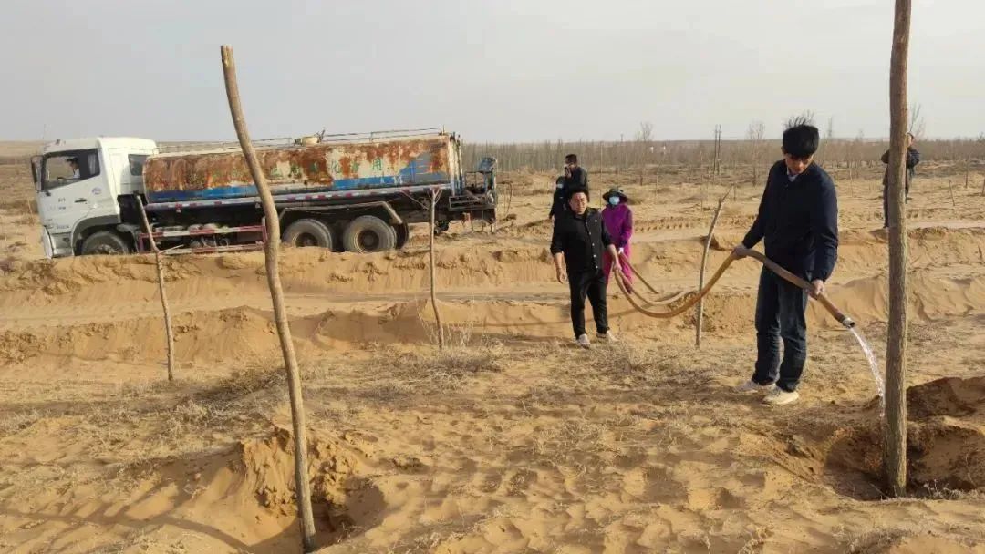 (靈武市自然資源局專業(yè)技術(shù)人員指導(dǎo)苗木保護,馬家灘鎮(zhèn)工作人員對苗木進行澆灌)