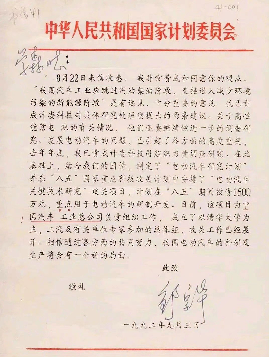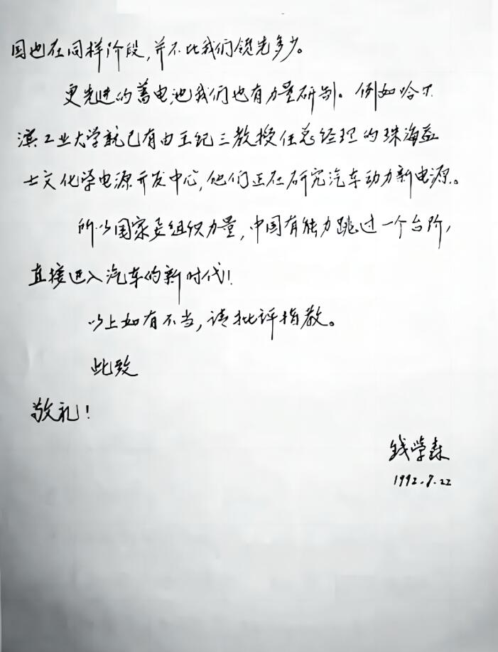 1992年,當時已81歲高齡的錢學森寫信給時任副總理鄒家華,提出了一個高瞻遠矚的建議:“我國汽車工業(yè)應跳過用汽油柴油階段,直接進入減少環(huán)境污染的新能源階段……到下個世紀20年代保護環(huán)境將是十分重要問題?,F在美國、日本、西歐都在組織各自技術力量攻高效蓄電池,計劃開發(fā)出蓄電池汽車。”