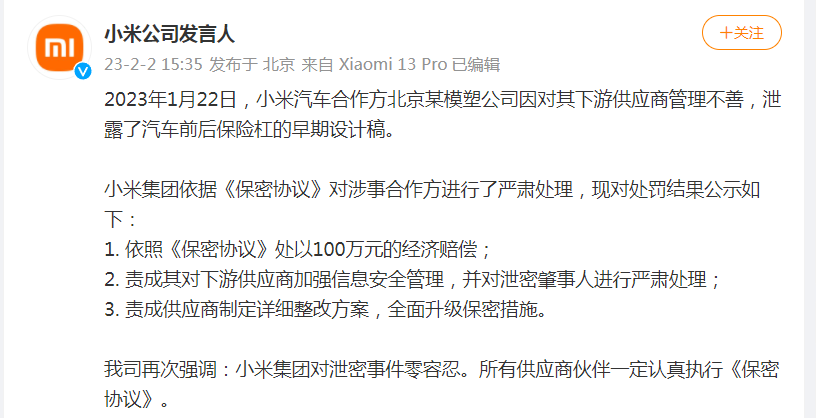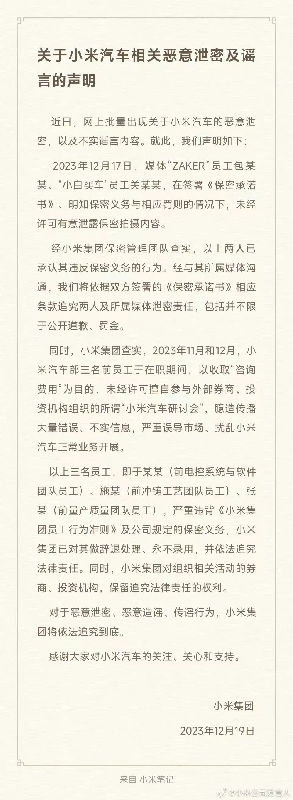《聲明》稱,2023年12月17日,媒體“ZAKER”員工包某某、“小白買車”員工關(guān)某某,在簽署《保密承諾書》、明知保密義務(wù)與相應(yīng)罰則的情況下,未經(jīng)許可有意泄露保密拍攝內(nèi)容。經(jīng)小米集團(tuán)保密管理團(tuán)隊查實,以上兩人已承認(rèn)其違反保密義務(wù)的行為。經(jīng)與其所屬媒體溝通,小米集團(tuán)將依據(jù)雙方簽署的《保密承諾書》相應(yīng)條款追究兩人及所屬媒體泄密責(zé)任,包括并不限于公開道歉、罰金。另外,《聲明》介紹,2023年11月和12月,小米汽車部三名前員工于在職期間,以收取“咨詢費用”為目的,未經(jīng)許可擅自參與外部券商、投資機構(gòu)組織的所謂“小米汽車研討會”,臆造傳播大量錯誤、不實信息,嚴(yán)重誤導(dǎo)市場、擾亂小米汽車正常業(yè)務(wù)開展。以上三名員工,即于某某(前電控系統(tǒng)與軟件團(tuán)隊員工)、施某(前沖鑄工藝團(tuán)隊員工)、張某(前量產(chǎn)質(zhì)量團(tuán)隊員工),嚴(yán)重違背《小米集團(tuán)員工行為準(zhǔn)則》及公司規(guī)定的保密義務(wù),小米集團(tuán)已對其做辭退處理、永不錄用,并依法追究法律責(zé)任。同時,小米集團(tuán)表示,對組織相關(guān)活動的券商、投資機會,保留追究法律責(zé)任的權(quán)利。小米汽車始終吸引市場高度關(guān)注,這也不是小米集團(tuán)第一次遭遇汽車泄密。今年1月22日,小米汽車合作方北京某模塑科技有限公司因?qū)ζ湎掠喂?yīng)商管理不善,泄露了小米汽車前后保險杠的早期設(shè)計稿。“小米公司發(fā)言人”微博今年2月更新了該泄密事件的處理結(jié)果:小米集團(tuán)表示,已依據(jù)《保密協(xié)議》對涉事合作方進(jìn)行了嚴(yán)肅處理,包括依照《保密協(xié)議》處以100萬元的經(jīng)濟賠償;責(zé)成其對下游供應(yīng)商加強信息安全管理,并對泄密肇事人進(jìn)行嚴(yán)肅處理;責(zé)成供應(yīng)商制定詳細(xì)整改方案,全面升級保密措施。