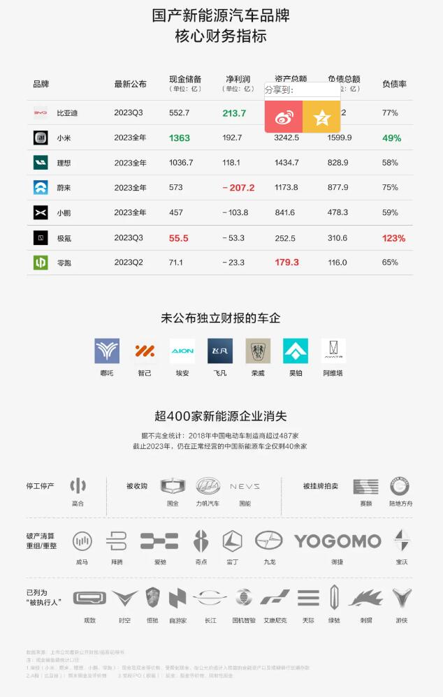 就是過(guò)去五年來(lái),內(nèi)卷加速“品牌淘汰”,大批造車企業(yè)消亡。據(jù)不完全統(tǒng)計(jì)僅在2018年-2023年五年間,銷聲匿跡的國(guó)產(chǎn)新能源品牌就超過(guò)400家,新能源這場(chǎng)大逃殺的淘汰了高達(dá)90%。而細(xì)細(xì)分析,這400多家品牌或多或少有著一些共性:小品牌、高負(fù)債、靠資本輸血、資金實(shí)力差。