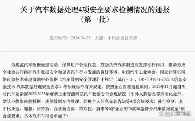 4月28日,中汽協(xié)官方發(fā)布《關(guān)于汽車數(shù)據(jù)處理4項(xiàng)安全要求檢測情況的通報(第一批)》,其中,比亞迪、理想、路特斯、合眾新能源(哪吒汽車)、特斯拉、蔚來6家企業(yè)的76款車型符合汽車數(shù)據(jù)安全4項(xiàng)合規(guī)要求。