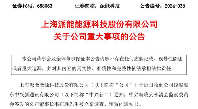 派能科技19日晚間披露的公告顯示,公司近日收到控股股東中興新通知,中興新收到永清縣監(jiān)察委員會(huì)簽發(fā)的公司董事長(zhǎng)韋在勝被立案調(diào)查、留置的通知書。