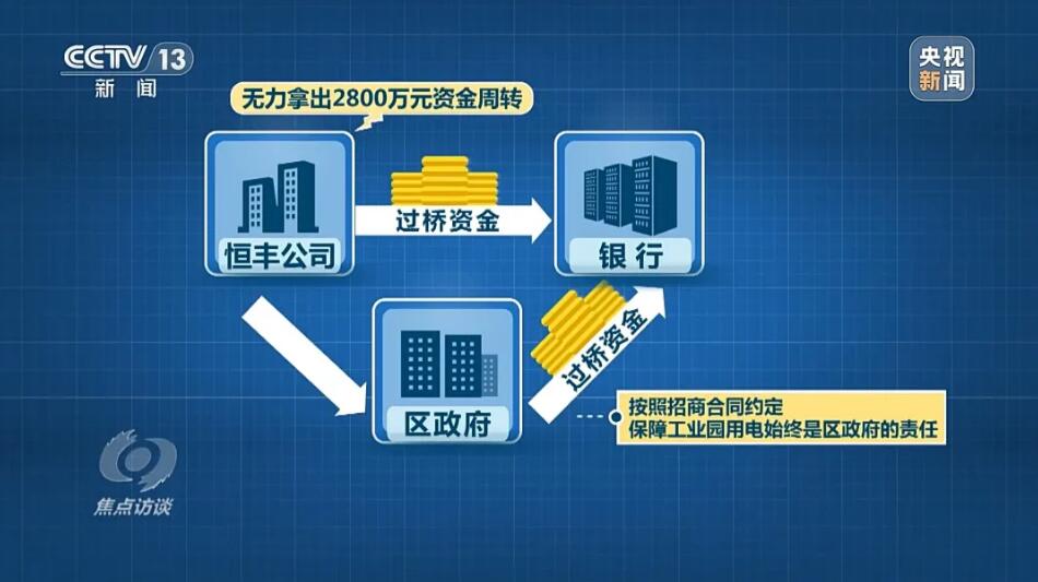 河南省駐馬店市經(jīng)濟(jì)開發(fā)區(qū)管委會(huì)副主任安寧:過橋資金2800萬,他自己拿不起,讓政府協(xié)調(diào)過橋資金,政府又為了免于擔(dān)風(fēng)險(xiǎn),幾經(jīng)努力,最后這個(gè)事沒有做成。說是為了免擔(dān)風(fēng)險(xiǎn),區(qū)政府沒有幫助協(xié)調(diào)下過橋資金,但是,也沒有履行確保恒豐公司用電負(fù)荷的約定。當(dāng)?shù)亟o產(chǎn)業(yè)園提供的一直是建設(shè)廠房時(shí)的臨時(shí)用電,220千伏變電站沒有如期建成,對(duì)企業(yè)造成的影響,當(dāng)?shù)卣质侨绾慰创哪?河南省駐馬店市經(jīng)濟(jì)開發(fā)區(qū)管委會(huì)副主任安寧:電力接上了,是臨時(shí)用電,建設(shè)期都給接了。記者:電力保障在前,還是應(yīng)該生產(chǎn)在前?河南省駐馬店市經(jīng)濟(jì)開發(fā)區(qū)管委會(huì)副主任安寧:電力保障在前。記者:正式用電的電力保障一直沒有進(jìn)行的原因是什么呢?河南省駐馬店市經(jīng)濟(jì)開發(fā)區(qū)管委會(huì)副主任安寧:這個(gè)你要問當(dāng)事人。
