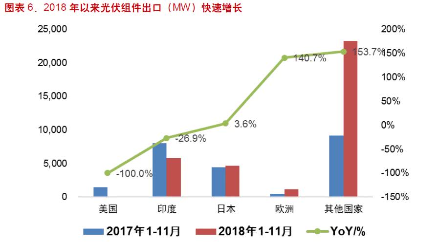 中國光伏行業(yè)協(xié)會的數(shù)據(jù)顯示,2018年光伏產(chǎn)品(硅片、電池片、組件)出口總額達(dá)161.1億美元,創(chuàng)下歐美“雙反”后最高水平,同比增長10.9%。組件市場方面,光伏市場出口集中度繼續(xù)下降,形成傳統(tǒng)市場和新興市場(南美、中東北非)結(jié)合的多元化市場傳統(tǒng)市場方面,因歐盟取消了長達(dá)五年的“雙反”政策,歐洲市場復(fù)蘇,對荷蘭、德國、英國等歐洲主要國家的組件出口同比增長,對烏克蘭、西班牙的組件出口大幅增長。中國光伏行業(yè)協(xié)會預(yù)測,歐盟市場2019年增速明顯增高,可達(dá)11GW,西班牙等啟動平價上網(wǎng)項目,法國、荷蘭、意大利等也將有較大幅度增長。
