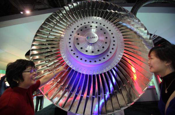 2009年10月4日,觀眾在北京展覽館觀看具有世界先進水平的百萬千瓦超超臨界發(fā)電機組中的金屬葉片。