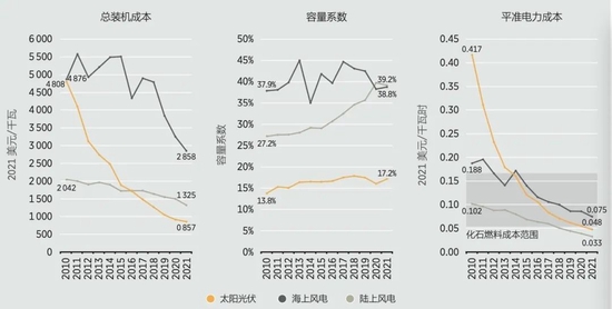 全球光伏、陸上和海上風(fēng)電的成本下降(2010-2021年) 數(shù)據(jù)來源:根據(jù)國際可再生能源署(IRENA)