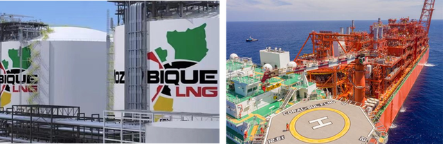 停產(chǎn)的莫桑比克LNG陸地工廠(chǎng)項(xiàng)目(左圖)與成功投產(chǎn)的莫桑比克FLNG項(xiàng)目(右圖)