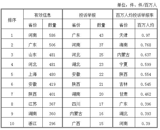 2018年5月,各?。ㄗ灾螀^(qū)、直轄市)按照有效信息數(shù)量排序,河南、廣東、山東、河北等省列全國前10位;按照投訴舉報(bào)數(shù)量排序,廣東、河南、河北等省排在全國前10位;按照百萬人均投訴舉報(bào)率排序,天津、海南、內(nèi)蒙古等省(市、自治區(qū))位于全國前10位。(2018年5月有效信息及投訴舉報(bào)排名前10位情況見表三)