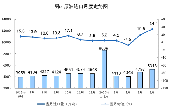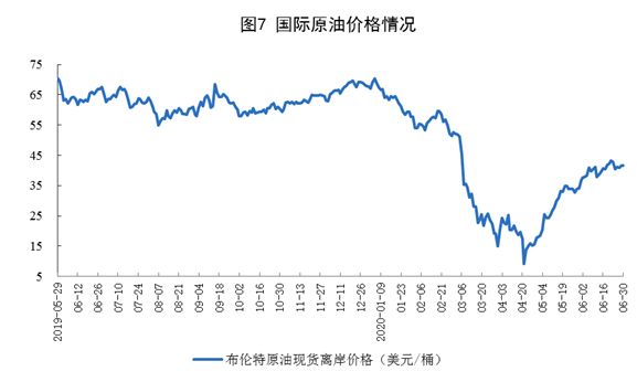 原油進(jìn)口快速增長,國際原油價格大幅回升。6月份,進(jìn)口原油5318萬噸,同比增長34.4%。上半年,進(jìn)口原油2.69億噸,同比增長9.9%,比一季度加快4.9個百分點(diǎn)。6月30日布倫特原油現(xiàn)貨離岸價格為41.64美元/桶,比5月29日的34.15美元/桶回升21.9%。