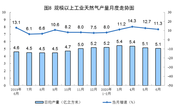天然氣生產(chǎn)保持較快增長。6月份,生產(chǎn)天然氣152億立方米,同比增長11.3%,增速比上月回落1.4個百分點(diǎn),日均產(chǎn)量5.1億立方米。上半年,生產(chǎn)天然氣940億立方米,同比增長10.3%,比一季度加快1.2個百分點(diǎn)。