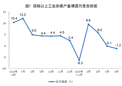 原煤生產(chǎn)小幅下降。6月份,生產(chǎn)原煤3.3億噸,同比下降1.2%,降幅比上月擴(kuò)大1.1個百分點(diǎn);日均產(chǎn)量1114萬噸,環(huán)比增加86萬噸。上半年,生產(chǎn)原煤18.1億噸,同比增長0.6%,一季度為下降0.5%。