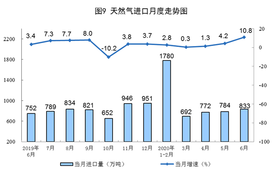 天然氣進(jìn)口增長明顯加快。6月份,進(jìn)口天然氣833萬噸,同比增長10.8%,增速比上月加快6.6個百分點(diǎn)。上半年,進(jìn)口天然氣4836萬噸,同比增長3.3%,比一季度加快1.5個百分點(diǎn)。