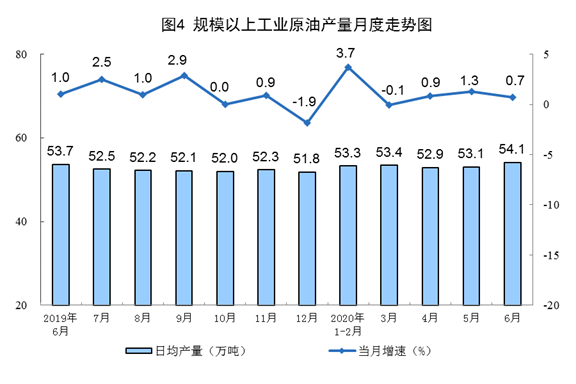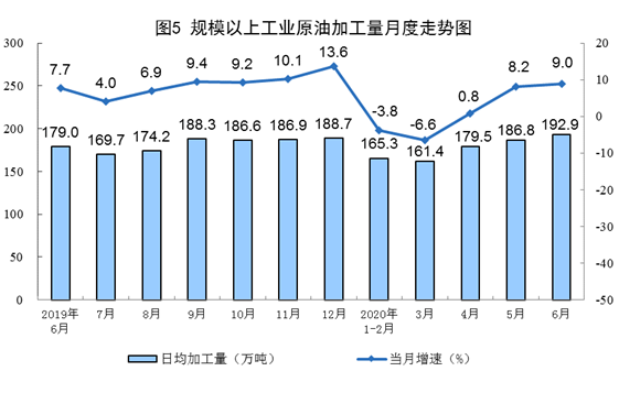 原油生產(chǎn)略有增長,加工量有所加快。6月份,生產(chǎn)原油1624萬噸,同比增長0.7%,增速比上月回落0.6個百分點(diǎn);加工原油5787萬噸,增長9.0%,比上月加快0.8個百分點(diǎn)。上半年,生產(chǎn)原油9715萬噸,同比增長1.7%,比一季度放緩0.7個百分點(diǎn);加工原油3.2億噸,同比增長0.6%,一季度為下降4.6%。