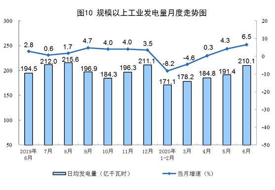 電力生產(chǎn)繼續(xù)加快。6月份,發(fā)電量6304億千瓦時,同比增長6.5%,增速比上月加快2.2個百分點(diǎn);日均發(fā)電量210.1億千瓦時,環(huán)比增加18.7億千瓦時。上半年,發(fā)電量33645億千瓦時,同比下降1.4%,降幅比一季度收窄5.4個百分點(diǎn)。