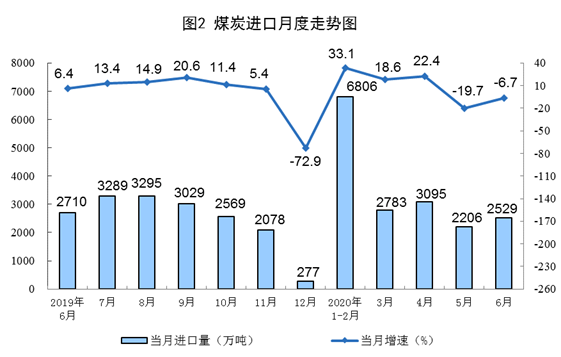 煤炭進(jìn)口下降。6月份,進(jìn)口煤炭2529萬噸,環(huán)比增加323萬噸,同比下降6.7%;上半年,進(jìn)口煤炭1.74億噸,同比增長12.7%,比一季度回落15.7個百分點(diǎn)。