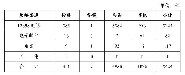 按反映渠道分類,12398電話8224件,電子郵件82件,留言117件,其他1件。(2020年10月收到有效信息情況見表一)