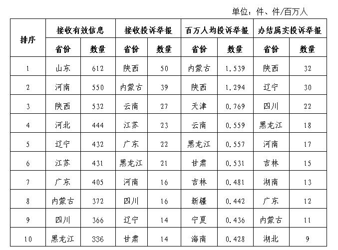 各省(自治區(qū)、直轄市)按照收到的有效信息數(shù)量排序,山東、河南、陜西、河北、遼寧、江蘇、廣東、內(nèi)蒙古、四川、黑龍江等列全國前10位;按照投訴舉報數(shù)量排序,陜西、內(nèi)蒙古、云南、江蘇、廣東、黑龍江、河南、四川、遼寧、甘肅等排在全國前10位。按照百萬人均投訴舉報數(shù)量排序,內(nèi)蒙古、陜西、天津、云南、黑龍江、甘肅、吉林、新疆、寧夏、海南等排在全國前10位。按照辦結(jié)屬實投訴舉報數(shù)量排序,陜西、遼寧、四川、黑龍江、河南、吉林、湖南、廣東、內(nèi)蒙古、湖北等排在全國前10位。(2020年10月有效信息及投訴舉報排名前10位情況見表三)