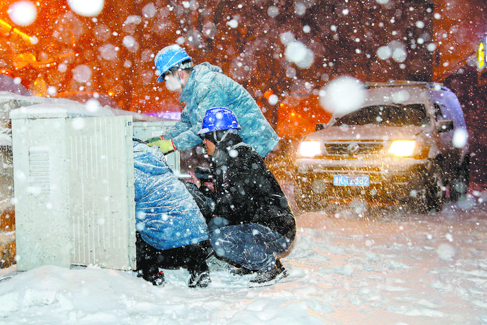 圖④ 1月6日,山東威海供電公司員工在花園南路小區(qū)搶修,快速恢復客戶供電。劉中華 攝