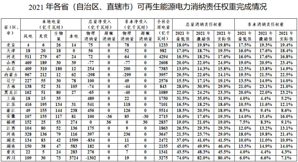 國家能源局關(guān)于2021年可再生能源電力消納責(zé)任權(quán)重完成情況的通報