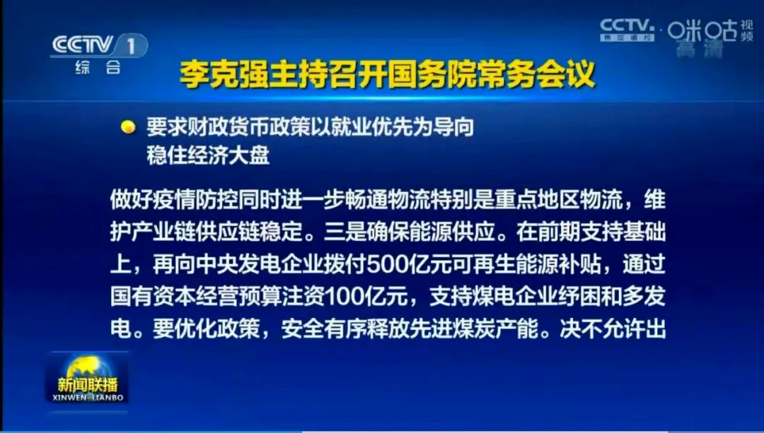 確保能源供應。在前期支持基礎上,再向中央發(fā)電企業(yè)撥付500億元可再生能源補貼,通過國有資本經(jīng)營預算注資100億元,支持煤電企業(yè)紓困和多發(fā)電。據(jù)企業(yè)反饋:此次為第二批500億補貼。