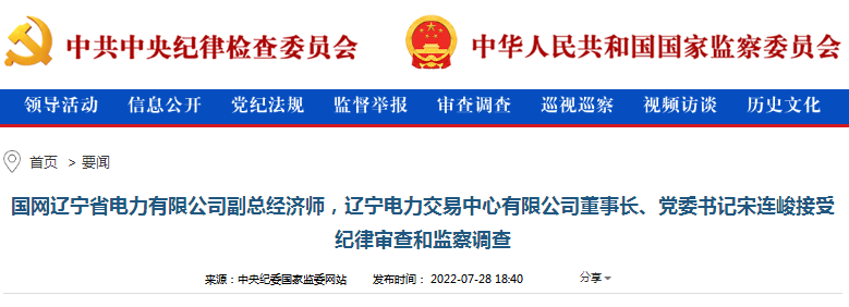 本網(wǎng)訊 中央紀(jì)委國家監(jiān)委網(wǎng)站7月28日消息,據(jù)中央紀(jì)委國家監(jiān)委駐國家電網(wǎng)有限公司紀(jì)檢監(jiān)察組、遼寧省紀(jì)委監(jiān)委消息:國網(wǎng)遼寧省電力有限公司副總經(jīng)濟(jì)師,遼寧電力交易中心有限公司董事長、黨委書記宋連峻涉嫌嚴(yán)重違紀(jì)違法,目前正接受中央紀(jì)委國家監(jiān)委駐國家電網(wǎng)有限公司紀(jì)檢監(jiān)察組紀(jì)律審查和朝陽市監(jiān)察委員會監(jiān)察調(diào)查。