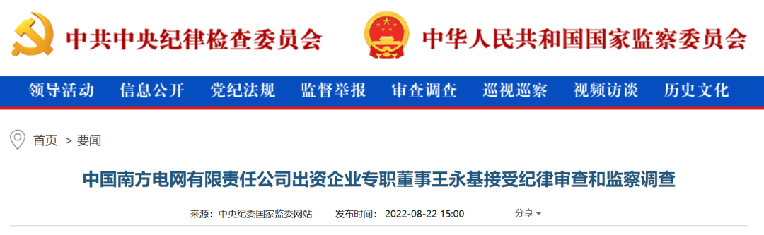 中紀(jì)委網(wǎng)站8月22日消息,中國南方電網(wǎng)有限責(zé)任公司出資企業(yè)專職董事王永基涉嫌嚴(yán)重違紀(jì)違法,目前正接受中國南方電網(wǎng)有限責(zé)任公司紀(jì)檢監(jiān)察組紀(jì)律審查和廣東省肇慶市監(jiān)察委員會監(jiān)察調(diào)查。