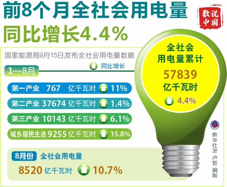 國(guó)家能源局:前8個(gè)月全社會(huì)用電量同比增長(zhǎng)4.4%
