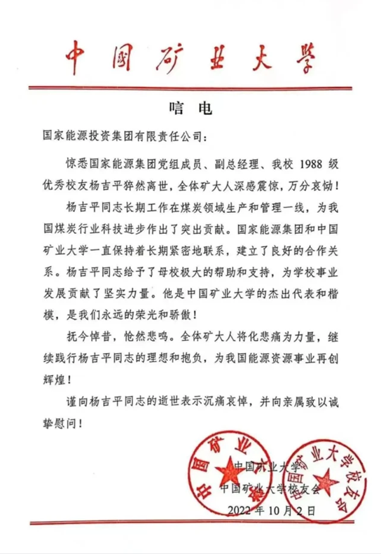 國家能源集團(tuán)黨組成員、副總經(jīng)理?xiàng)罴酵?,因突發(fā)疾病搶救無效,于2022年10月2日9時(shí)33分在北京不幸逝世,享年53歲。他的遺體送別會(huì),于10月4日上午11:30在北京八寶山殯儀館舉行。