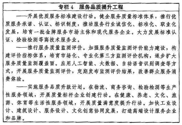 (七)提高產(chǎn)業(yè)質(zhì)量競爭水平。推動產(chǎn)業(yè)質(zhì)量升級,加強(qiáng)產(chǎn)業(yè)鏈全面質(zhì)量管理,著力提升關(guān)鍵環(huán)節(jié)、關(guān)鍵領(lǐng)域質(zhì)量管控水平。開展對標(biāo)達(dá)標(biāo)提升行動,以先進(jìn)標(biāo)準(zhǔn)助推傳統(tǒng)產(chǎn)業(yè)提質(zhì)增效和新興產(chǎn)業(yè)高起點發(fā)展。推進(jìn)農(nóng)業(yè)品種培優(yōu)、品質(zhì)提升、品牌打造和標(biāo)準(zhǔn)化生產(chǎn),全面提升農(nóng)業(yè)生產(chǎn)質(zhì)量效益。加快傳統(tǒng)制造業(yè)技術(shù)迭代和質(zhì)量升級,強(qiáng)化戰(zhàn)略性新興產(chǎn)業(yè)技術(shù)、質(zhì)量、管理協(xié)同創(chuàng)新,培育壯大質(zhì)量競爭型產(chǎn)業(yè),推動制造業(yè)高端化、智能化、綠色化發(fā)展,大力發(fā)展服務(wù)型制造。加快培育服務(wù)業(yè)新業(yè)態(tài)新模式,以質(zhì)量創(chuàng)新促進(jìn)服務(wù)場景再造、業(yè)務(wù)再造、管理再造,推動生產(chǎn)性服務(wù)業(yè)向?qū)I(yè)化和價值鏈高端延伸,推動生活性服務(wù)業(yè)向高品質(zhì)和多樣化升級。完善服務(wù)業(yè)質(zhì)量標(biāo)準(zhǔn),加強(qiáng)服務(wù)業(yè)質(zhì)量監(jiān)測,優(yōu)化服務(wù)業(yè)市場環(huán)境。加快大數(shù)據(jù)、網(wǎng)絡(luò)、人工智能等新技術(shù)的深度應(yīng)用,促進(jìn)現(xiàn)代服務(wù)業(yè)與先進(jìn)制造業(yè)、現(xiàn)代農(nóng)業(yè)融合發(fā)展。