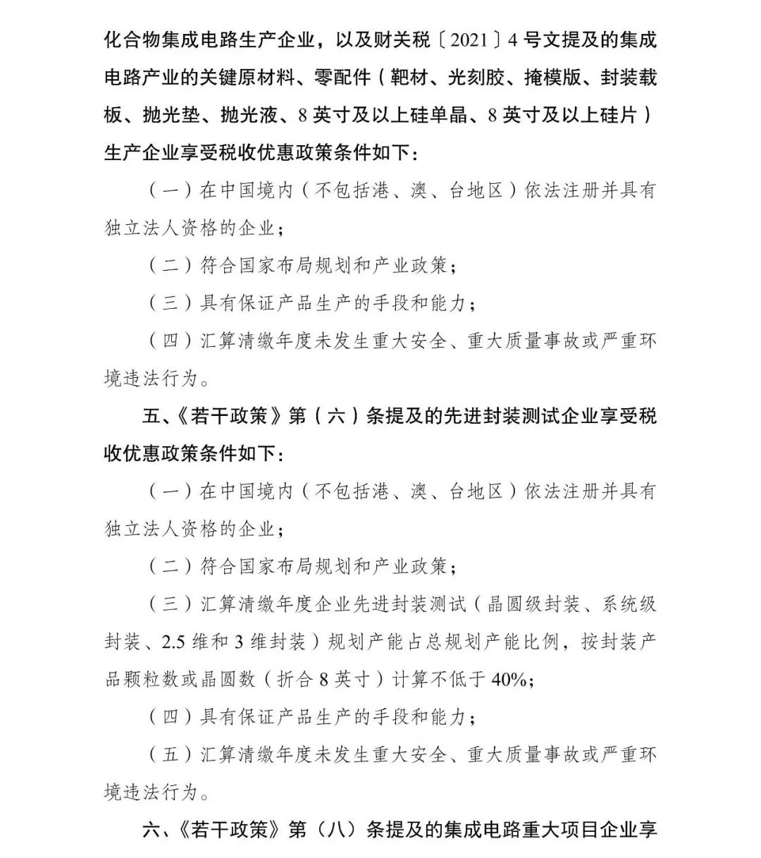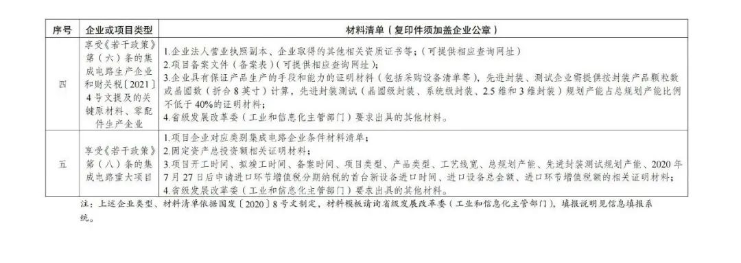 三、地方發(fā)改和工信部門根據(jù)企業(yè)條件和項(xiàng)目標(biāo)準(zhǔn)(附后),對企業(yè)申報(bào)的信息進(jìn)行初核通過后,報(bào)送至國家發(fā)展改革委、工業(yè)和信息化部。《若干政策》第(一)、(三)、(六)、(七)條,以及財(cái)關(guān)稅〔2021〕4號文提及的集成電路產(chǎn)業(yè)的關(guān)鍵原材料、零配件生產(chǎn)企業(yè)清單,由國家發(fā)展改革委、工業(yè)和信息化部、財(cái)政部、海關(guān)總署、稅務(wù)總局進(jìn)行聯(lián)審確認(rèn)并聯(lián)合印發(fā)?!度舾烧摺返?八)條提及的集成電路重大項(xiàng)目,由國家發(fā)展改革委、工業(yè)和信息化部形成清單后函告財(cái)政部,財(cái)政部會(huì)同海關(guān)總署、稅務(wù)總局最終確定。