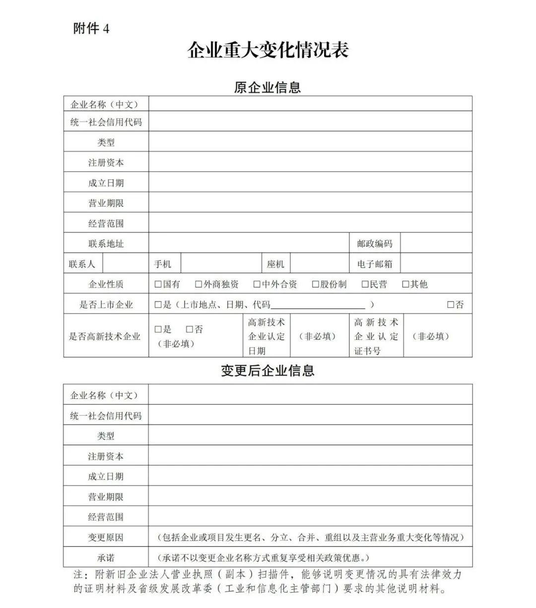 五、已享受《若干政策》第(一)、(三)、(六)、(七)條,以及財(cái)關(guān)稅〔2021〕4號文提及的關(guān)稅優(yōu)惠政策的企業(yè)或項(xiàng)目發(fā)生更名、分立、合并、重組以及主營業(yè)務(wù)重大變化等情況,應(yīng)及時(shí)向地方發(fā)改和工信部門報(bào)告,并于完成變更登記之日起60日內(nèi),將企業(yè)重大變化情況表和相關(guān)材料報(bào)送國家發(fā)展改革委、工業(yè)和信息化部(以省級部門上報(bào)文件落款日為準(zhǔn))。國家發(fā)展改革委、工業(yè)和信息化部會(huì)同相關(guān)部門確定發(fā)生變更情形后是否繼續(xù)符合享受優(yōu)惠政策的企業(yè)條件或項(xiàng)目標(biāo)準(zhǔn)。