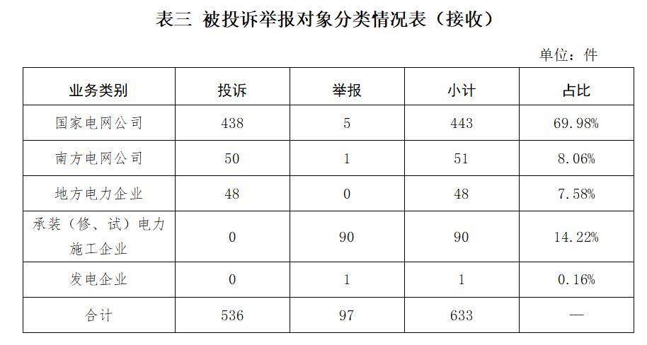針對(duì)供電企業(yè)的投訴舉報(bào)542件、占比85.62%,其中國(guó)家電網(wǎng)公司443件、占比69.98%,南方電網(wǎng)公司51件、占比8.06%,地方電力企業(yè)48件、占比7.58%;針對(duì)承裝(修、試)電力施工企業(yè)的投訴舉報(bào)90件、占比14.22%;針對(duì)發(fā)電企業(yè)的投訴舉報(bào)1件、占比0.16%。(詳見表三)