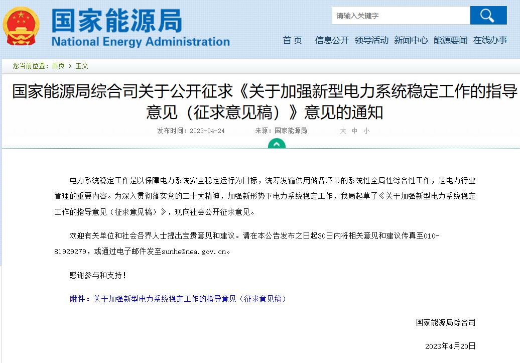 國家能源局綜合司關(guān)于公開征求《關(guān)于加強新型電力系統(tǒng)穩(wěn)定工作的指導(dǎo)意見(征求意見稿)》意見的通知