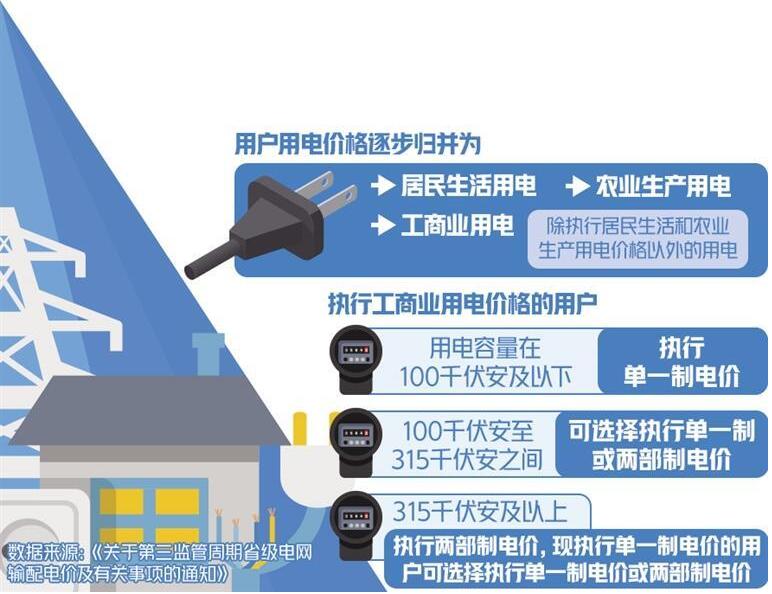 《通知》提出,執(zhí)行工商業(yè)用電價(jià)格的用戶(hù),用電容量在100千伏安及以下的,執(zhí)行單一制電價(jià);100千伏安至315千伏安之間的,可選擇執(zhí)行單一制或兩部制電價(jià);315千伏安及以上的,執(zhí)行兩部制電價(jià),現(xiàn)執(zhí)行單一制電價(jià)的用戶(hù)可選擇執(zhí)行單一制電價(jià)或兩部制電價(jià)。